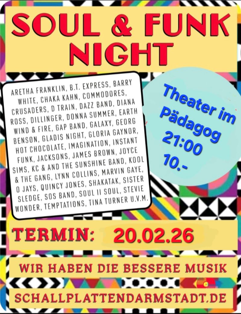 "Mittlerweile fest etabliert und ein immer sehr gut besuchte Treff für Fans von Soul und Funk in Darmstadt und so einmalig weil Themen Nacht, nur Soul & Funk aber mit 100% Tanzgarantie!"